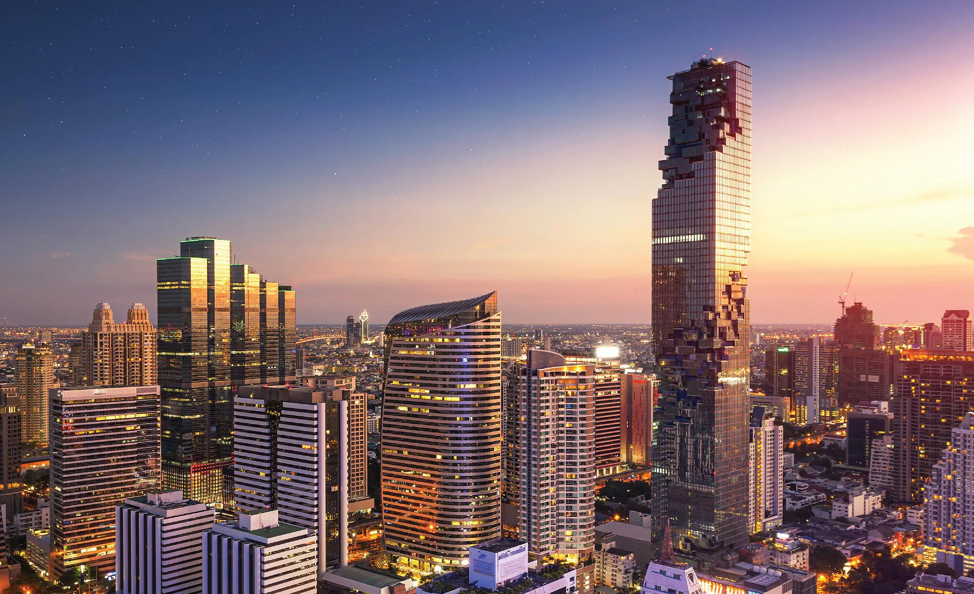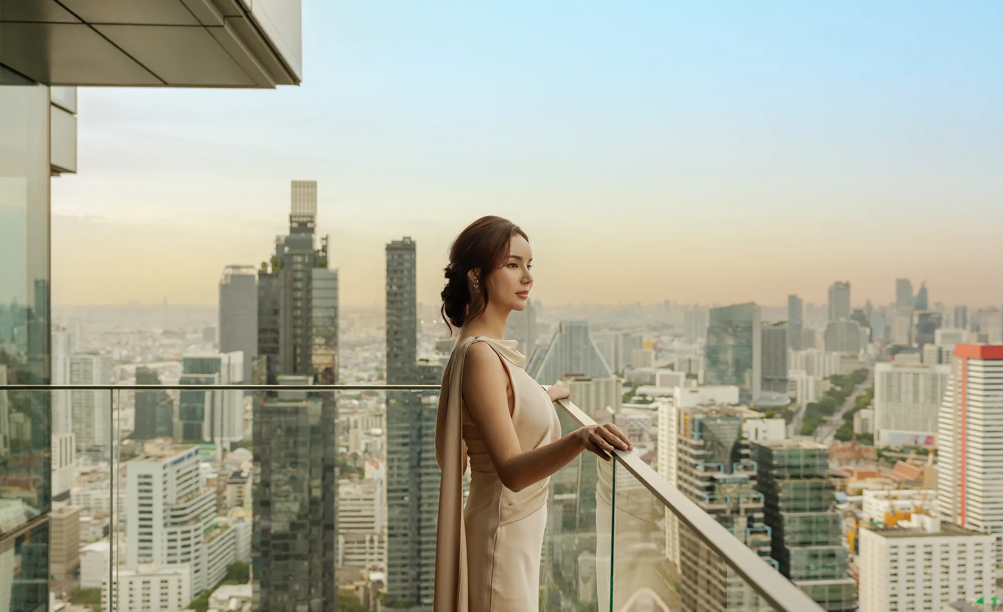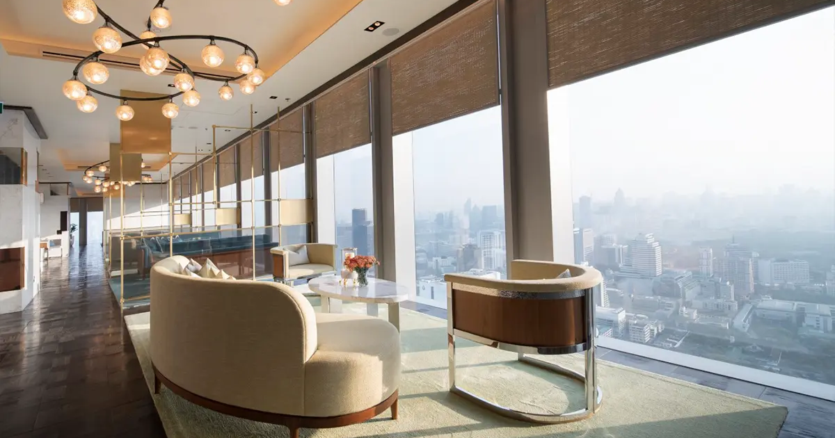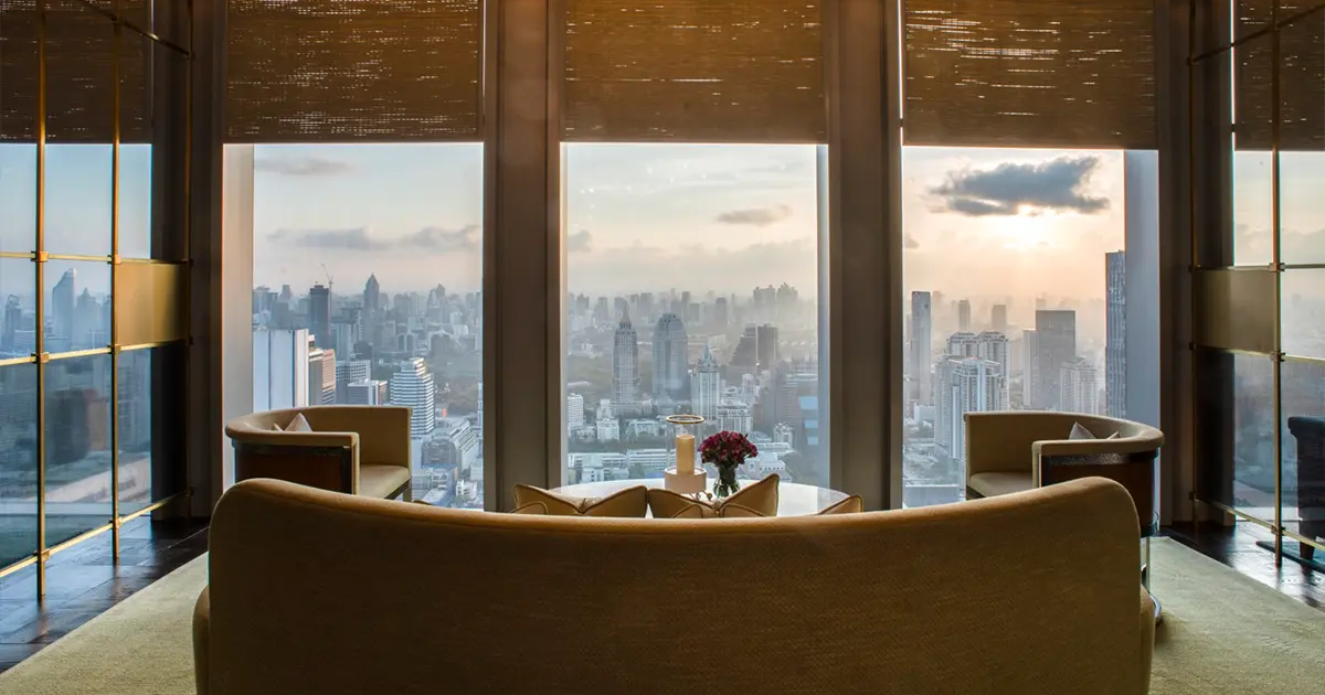 Spectacular views over Bangkok City, Lumpini Park, the Chao Phraya River and further beyond to the Gulf of Thailand.